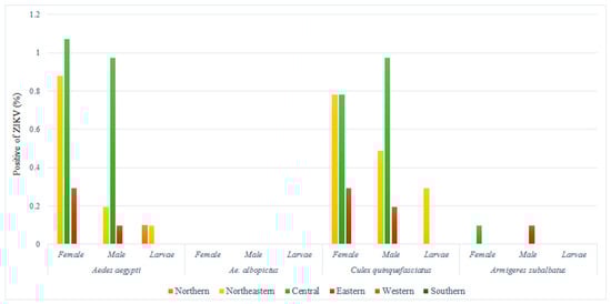 A total of 1026 mosquito samples were collected in the 31 provinces of six regions in affected areas in 2016, including 626 females, 367 males, and 33 larvae. Positive samples were found in 15 provinces, of which most were found in the central region (Figure 1). ZIKV RNA was detected in 7.7% (79/1026) of mosquitoes, of which 4.19% positive samples were found in female, 3.03% in male, and 0.48% in larval mosquitoes. Mosquitoes infected with ZIKV were found in Ae. aegypti (2.24% female, 1.27% male, and 0.19% larva), Cx. quinquefasciatus (1.85% female, 1.66% male, and 0.29% larva) and Ar. subalbatus (0.1% female and 0.1% male) (Figure 2), whereas we were unable to detect ZIKV RNA in Ae. albopictus. The ZIKV sequences showed 98–100% sequence identity with the partial NS5 genes of ZIKV available in the GenBank database. For the first time, we detected ZIKV RNA in Cx. quinquefasciatus among female, male, and larvae in Thailand. We think that Ae. aegypti, Cx. quinquefasciatus, and Ar. subalbatus should be considered vectors of ZIKV infection in Thailand.