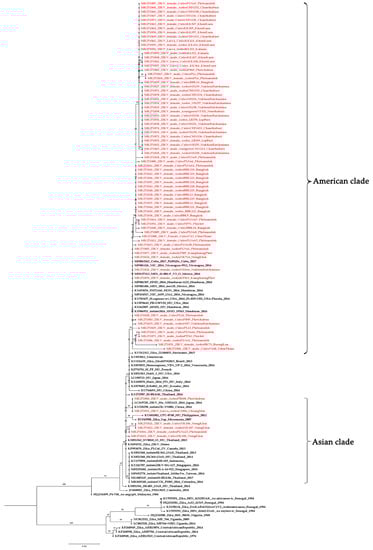 Phylogenetic tree of ZIKV mosquitoes constructed from partial NS5 sequences from all region of Thailand. The maximum likelihood was constructed with IQ-TREE by using the maximum-likelihood method with 1000 ultrafast bootstrap replicates. The best-fit model of substitution was found using the auto function on the IQ-TREE web server. The sequences from this study are indicated with a red color.