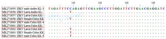The 79 sequences, when compared with the GenBank database, were similar to ZIKV and showed the clade to be within the Asian lineage. The nucleotide sequences of NS5 of ZIKV were submitted to the GenBank database, accession numbers MK271800–MK271878. We report the genetic variations in ZIKV from mosquitoes collected from several geographic regions. The ZIKV from mosquitoes in this study can be classified into two clades: The Asian clades from Chiang Mai, Nong Khai, Phitsanulok, and Phetchabun, closely related to a previous report in Thailand [,]; and the American clade related to ZIKV found in the Americas (Figure 3). The intraspecific variation analysis between the Asian and the American clade showed 1–6% variation. For the interspecific variation in this study, the Asian lineage showed 15–19% variation from the African lineage. Sequences of ZIKV obtained from adults and larvae of same mosquito species were compared. Some adults and larvae were 100% identical and some showed differences in ZIKV sequences between adults and larvae of the same mosquito species (Figure 4).