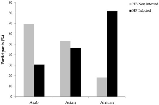 Since people of several ethnicities reside in UAE, it was of great interest to investigate which ethnicity is more prone to H. pylori infection. A significant statistical difference was found between H. pylori infection and the ethnicity of the participants (p < 0.0001) (Table 2). African residents in UAE presented the highest prevalence to H. pylori (18, 81.8%) compared to Asian (77, 46.7%) and Arab participants (50, 30.7%) (Figure 1). Among the Asian group, participants from India were found more infected by H. pylori (39%) followed by participants from Pakistan (23%) and the Philippines (21%). Among African participants, the prevalence of Ethiopian participants presented the highest positivity to H. pylori (71%). In Arab participants, Emiratis were the most prone to H. pylori infection (55%) compared to other Arab nationalities. All other Arab participants presented a similar prevalence to H. pylori. Taking together all H. pylori-infected participants, the prevalence was the highest among the Ethiopian nationality (71%) compared to the other nationalities (data not shown).