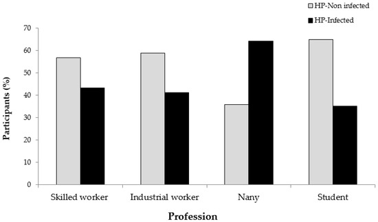In term of participant occupation, a statistically significant difference was found between H. pylori and occupation of participants (p = 0.001). Among the considered occupations, nannies showed the highest prevalence to H. pylori (36, 64.3%) followed by professional workers (16, 43.2%), industrial workers (40, 41.2%), and students (51, 35.2%) (Figure 2).