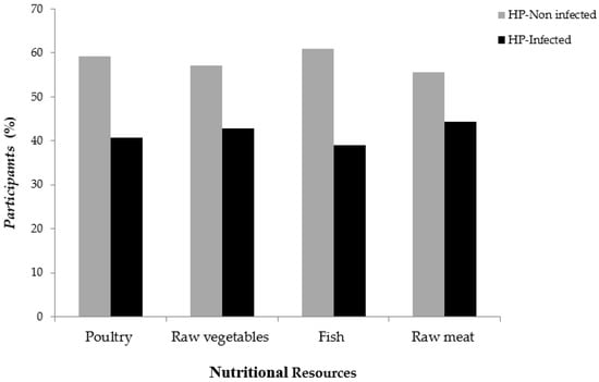 In term of the drinking water source, even though most of the participants confirmed drinking mineral bottled water (283, 80.9%), a statistically significant difference was found between H. pylori and tap water as a source of drinking water (p = 0.001). More than half of participants drinking tap water were found positive to H. pylori (34, 58.6%). In term of gastrointestinal characteristics, even though 82.3% of the involved participants were healthy and asymptomatic without any gastrointestinal disturbances, few participants have mentioned suffering from gastrointestinal disturbances. Interestingly, a statistically significant difference was found between the H. pylori infection and the gastrointestinal disturbances (p = 0.001). Participants suffering from abdominal pain were found highly prevalent to H. pylori (22, 75.9%) followed by bloating (8, 40%). When family history of gastrointestinal diseases was investigated, it was found that participants having one of their parents with previous or current peptic ulcer diseases were highly prevalent to H. pylori (28, 90.3%) with a statistically significant difference (p < 0.0001). There was no statistically significant difference found between nutritional resources and H. pylori infection (Figure 3).
