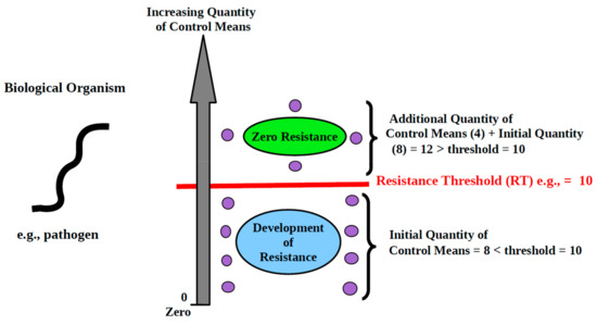 None of those forms of resistance, however, is any less common than the others, all forms being rampant [3,50]. Consequently, resistance in agriculture is one that is not confined to just one kingdom. Not only does it manifest within each respective kingdom, it also crosses border from one kingdom to another and vice-versa—straddling any two kingdoms at a time. Additionally, it is worth noting that, beyond those four types, a fifth type of resistance occurs in agriculture, even in the complete absence of a chemical attack. That is the case of a plant developing resistance to the mechanical action of a pest feeding on its leaves [51]. This one type of resistance is important—because it shows that the development of resistance by a biological organism is not necessarily mediated by chemicals as other types of resistance, as in medicine, would have us believe. What this means is that resistance as a process can be elicited through means other than chemicals or molecules. Resistance, factually, therefore, is simply a defensive mechanism which, meant to protect the biological organism, can take any form and is not restricted to chemical processes alone. As we look across the various realms of biological life with its multiple kingdoms, we see that living organisms, no matter their size or biological complexity, have the capacity to deploy resistance to any oncoming life-threatening agent, the success or failure of which resistance in preserving the biological organism’s life is function of the strength of the oncoming life-threatening agent. Resistance, therefore, is everywhere prevalent in nature, occurs in a variety of ways, and turns out to be a natural process arising spontaneously in biological organisms whenever a situation of threat arises.