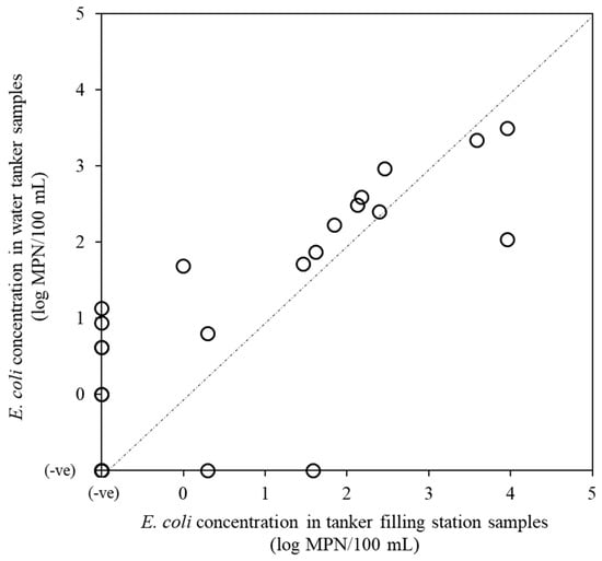 Fifty-two percent (16/31) of TFS samples were contaminated with E. coli, indicating poor performance of the treatment plants. E. coli detection in 70% (21/30) of WT samples with concentrations higher than the World Health Organization (WHO) guideline values for drinking water (<1 MPN/100 mL) indicated the unsuitability of this tanker water for drinking purposes [27]. When the relationship between E. coli detection and free or combined chlorine concentrations was examined, there was a decreasing trend in the positive ratios of E. coli as the concentrations of free and combined chlorine increased. However, there was a low positive ratio of E. coli in the category 0.00–0.05 mg/L of free chlorine, which could be due to the presence of combined chlorine. This result suggested that chlorine application could be a useful measure for lowering the concentration of E. coli in WTs. Although the difference was not significant, the concentrations of E. coli in WT samples were higher compared with their corresponding TFS samples. E. coli was detected in 46% (6/13) of WT samples that were negative for the corresponding TFSs. These results indicated that tankers are not disinfected and/or cleaned regularly. A similar result was obtained in Lebanon, where eight tankers had higher concentrations of fecal coliforms than their water sources [28].