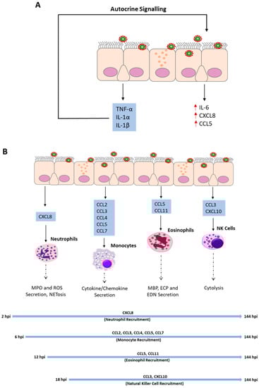 Autocrine signaling of TNF-α, IL-1α, and IL-1β amplifies the secretion of the proinflammatory cytokine IL-6 and the chemokines CXCL8 and CCL5 following RSV infection (A); Primary airway epithelial cells and airway epithelial cell lines secrete chemokines at different time points throughout the course of RSV infection as outlined in Table 1. The chemokines facilitate the recruitment of innate immune cells from the periphery to the lung where they implement antiviral actions through various cell-specific mechanisms (B). Major Basic Protein (MBP), Eosinophil Cationic Protein (ECP), Eosinophil-derived neurotoxin (EDN), Myeloperoxidase (MPO), reactive oxygen species (ROS).