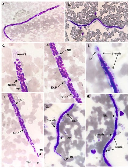 Microfilaria of Dirofilaria spp. (A,C,D,F) and Brugia spp. (B,E,G,H), Giemsa stain, 100×. The morphological marks show the position of several structures: The cephalic space (CS), nerve ring (NR), excretory pore (Ex.P), excretory cell (Ex.C), genital cell (G1), anal pore (AP), and terminal nucleus (TN).
