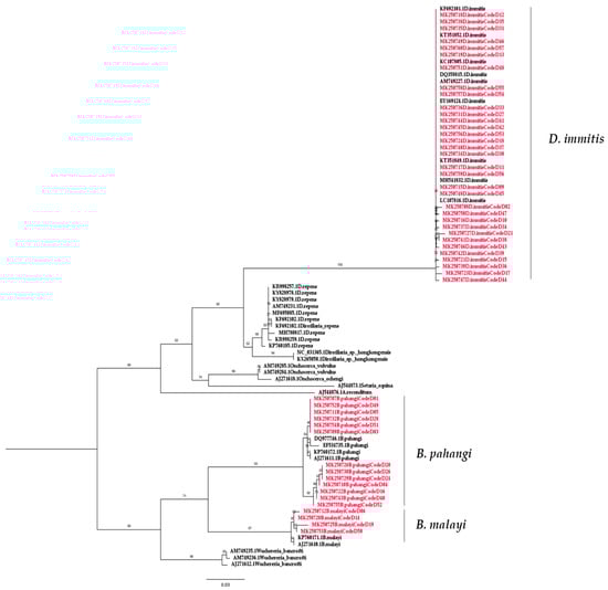 Phylogenetic tree of filarial worms constructed from the partial COI sequences. The red color represents the individual and combination identification sequences compared with reference isolates obtained from GenBank. Branch support was estimated based on 1000 bootstrap replicates.