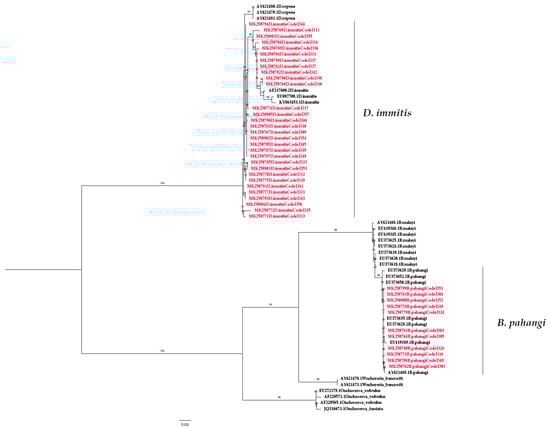 Phylogenetic tree of filarial worms constructed from ITS1 sequences. The red color represents the individual and combination identification sequences compared with reference isolates obtained from GenBank. Branch support was estimated based on 1000 bootstrap replicates.