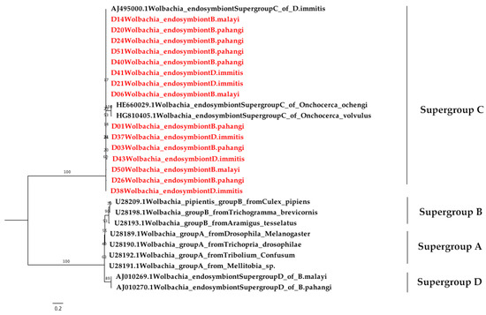 Phylogenetic tree of Wolbachia from filarial worms constructed from the partial FtsZ sequences. The red color represents the individual and combination identification sequences compared with reference isolates obtained from GenBank. Branch support was estimated based on 1000 bootstrap replicates.