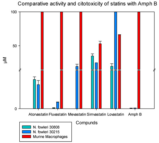 Therefore, the in vitro activities of six statins (simvastatin, fluvastatin, atorvastatin, pravastatin, mevastatin and lovastatin) were evaluated against the trophozoite stage of N. fowleri, using a colorimetric method based on alamarBlue® in comparison with the reference drug Amphotericin B (Amph B). In addition to the activity assays, an in vitro toxicity assay was also performed [32,33,34].