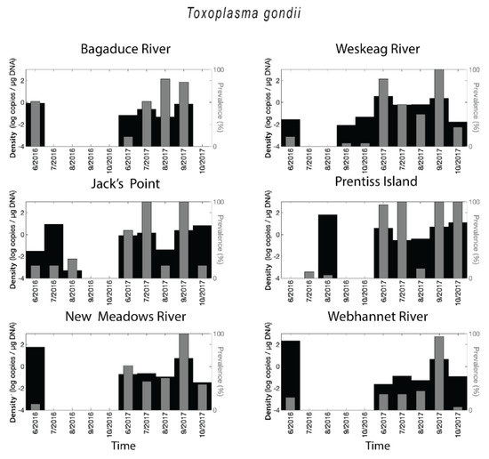 Spatial-temporal patterns for Toxoplasma gondii. Retention density (as log of copies per µg DNA, shown as black bars) and parasite prevalence (as a percentage of oysters infected, shown as grey bars) for each sampling site, for each sampling period.