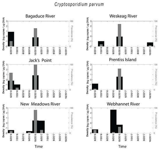 Cryptosporidium parvum DNA was detected at each of the six sites (Figure 3). The highest prevalence for C. parvum corresponded to October 2016 for five of the six sites, with values reaching 100% (Jack’s Point, DRE). This finding appears to have been a distinct, synchronous event across the Midcoast region of Maine, with the only excluded site being the southern Webhannet River site. Other than this event, the prevalence was generally low to zero, with only one other site and date where prevalence surpassed 50% (Jack’s Point, June 2016). In 2017 C. parvum was almost absent. When the parasite was present, C. parvum densities were in the range of less than 0.1 up to 423 copies/µg DNA for C. parvum. High levels of retention generally corresponded with the October 2016 event, but in a few instances (e.g., Bagaduce River, June 2016; New Meadows River, June 2017; Webhannet River, November 2016), retention was high despite low prevalence (Figure 3). Overall, 10% of oyster samples were positive for C. parvum.