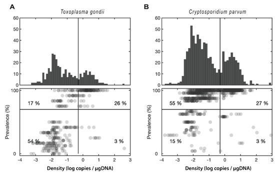 Distribution of prevalence versus intensity for the sampled sites. (A) Toxoplasma gondii. (B) Cryptosporidium parvum. Upper panel shows a histogram of parasite densities (as copies per µg DNA, log scale). The vertical line marks the split in the bimodal distribution. Lower panel shows a scatter plot of parasite densities versus prevalence (percentage of oysters infected at a given site/time). The numbers indicate the percentage of points that fall within each quadrant.