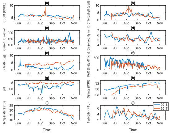 Prentiss Island environmental parameters. Averaged daily means for carbon dissolved organic matter (CDOM) (a), chlorophyll (b), current direction (c), dissolved oxygen (d), nitrate (e), photosynthetically active radiation (PAR) (f), pH (g), salinity (h), temperature (i), and turbidity (j) from a buoy located near the Prentiss Island (DRE) sampling site; data from 2016 (blue) and 2017 (red).