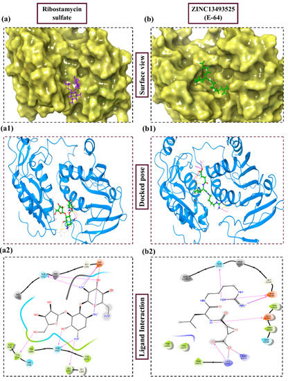 Figure 3. Depiction of poses within the active site of nsp2 protease: (a,b) Surface view of docked compounds binding pose of (a1) Ribostamycin sulfate and (b1) ZINC13493525 (E-64) with 3TRK. Interaction with active site residues are shown in (a2) Ribostamycin sulfate & (b2) ZINC13493525.