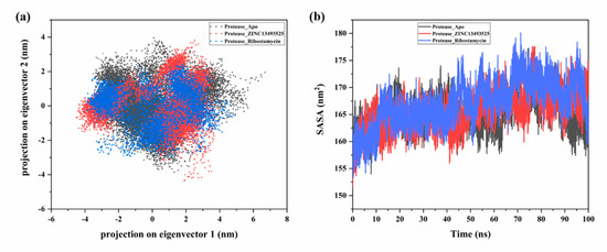 Figure 5. (a) Principal component analysis showing projections on two major components after 100 ns simulation for protease in complex with ZINC13493525 (E-64) (red) and Ribostamycin sulfate (blue) with apo protease (black). (b) Solvent accessible surface area of protease in bound and unbound form. Color schemes are same as (a).