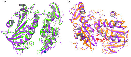 Figure 6. Superimposition of conformations before and after simulation in bound and unbound forms: (a) Apo conformations of nsp2 protease before (light green) and after simulation (violet) are overlapped with each other and residues, (b) superimposed conformations after simulation of unbound (violet) and E-64 bound protease (orange). The ligand E-64 is shown in red color.