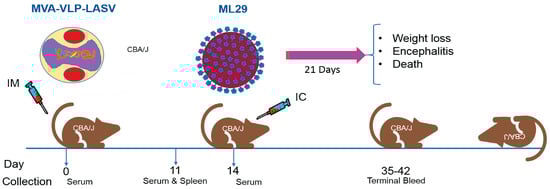 ML29 challenge model; schedule of vaccination, sample collections and intracerebral (IC) challenge. CBA/J mice are vaccinated with a single dose of GEO-LM01 (MVA-VLP-LASV) (1 × 107 TCID50 in 100 µL volume) by the intramuscular (IM) route. Three mice are sacrificed on day 11, sera and spleens were collected for assessment of antibody and T cell responses. The remaining mice are challenged on day 14 by the IC route with 1000 plaque forming units (PFU) of ML29 virus. After challenge, mice are observed for weight loss, signs of encephalitis and death.
