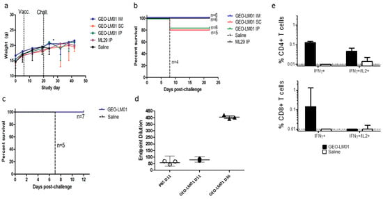 Efficacy and immunogenicity of GEO-LM01. Weight loss (a) and survival curves (b) following immunization by various routes then challenged with IC with ML29 virus 14 days later. * demonstrates death of control animals. (c) Survival curves of animals vaccinated by IM route only. (d) ML29-specific Ab titers from immunized on days 11 and 36 (22 days after challenge) and mock-immunized mice on day 11 as determined by ELISA. (e) Percentage of antigen-specific CD4+ and CD8+ T cells expressing IFNγ and IL2 in response to LASV GP peptides from GEO-LM01 or saline immunized animals were assessed by flow cytometry. These data demonstrate considerable differences between immunization groups but are not statistically significant.
