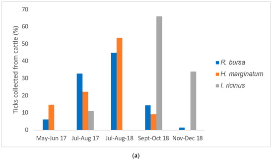 The infestation rate in cattle was 19.2% (27/140) in 2017 (May–August 2017) and 36.0% (87/241) in 2018 (July–December 2018). Overall, the July–August 2018 infestation rate (65.1%; 54/83) was significantly higher than the July–August 2017 infestation rate (46.5%; 40/86) (p = 0.02), with a peak in July 2018 (70.7%; 29/41) (Figure 1a). The observed proportion of H. marginatum was significantly higher in July–August 2018 (53.7%; 116/216) than in July–August 2017 (22.2%; 48/216) (p < 0.0001) (Figure 1). Similarly, the observed proportion of R. bursa was significantly higher in July–August 2018 (45.0%; 208/608) than July–August 2017 (33.0%; 273/608) (p < 0.0001) (Figure 1a). Ixodes ricinus showed its peak activity in September–October 2018 (60.0%; 6/10).