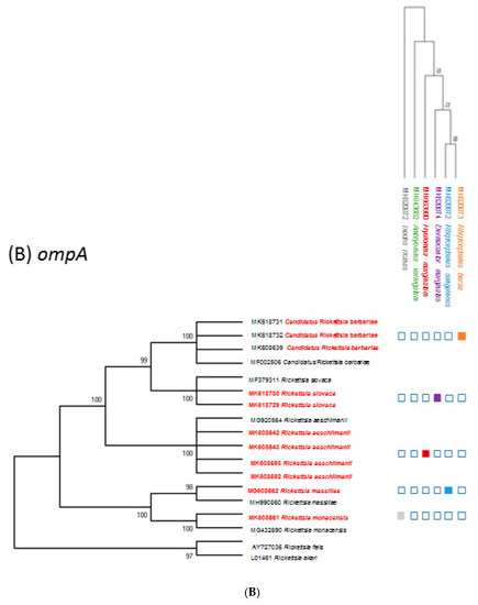 (A) A phylogenetic tree of spotted fever-group Rickettsine based on the gltA gene sequences. The analysis was performed using a maximum-likelihood method with the Kimura 2-parameter model. This analysis involved 27 nucleotide sequences. A II ambiguous positions were removed for each sequence pair. There were a total of 744 positions in the final dataset. The sequences detected in this study are indicated in red. The simlified tick phylogeny consisting of four species is indicated on the top right. The colored boxes indicate the presence of Rickettsia DNA in each tick species. (B) A phylogenetic tree of spotted-fever group Rickettsiae based on the ompA gene sequences. The analysis was performed using a maximum-likelihood method with the Kimura 2-parameter model. This analysis involved 18 nucleotide sequences. All ambiguous positions were removed for each sequence pair. There were a total of 493 positions in the final dataset. The sequences detected in this study are indicated in red. The simplified tick phylogeny consisting of four species is indicated on the top right. The colored boxes indicate the presence of Rickettsia DNA in each tick species.