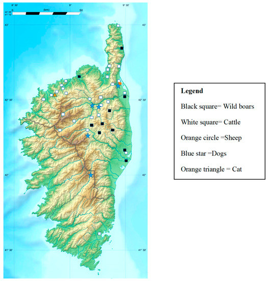 - Grech-Angelini, S.; Stachurski, F.; Lancelot, R.; Boissier, J.; Allienne, J.F.; Marco, S.; Maestrini, O.; Uilenberg, G. Ticks (Acari: Ixodidae) infesting cattle and some other domestic and wild hosts on the French Mediterranean island of Corsica. Parasit. Vectors 2016, 9, 582. [Google Scholar] [CrossRef]
