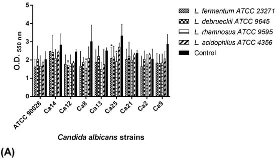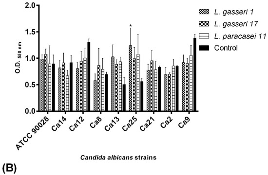 All BSs, except those of Lp11, increased the adhesion of Ca13 and Ca25 isolates in relation to the control. BS from L. fermentum ATCC 23271 also increased the adhesion capacity of C. albicans isolates ATCC 90028, Ca8, Ca21, and Ca2. The product of L. debrueckii ATCC 9645 also enhanced the adhesion of C. albicans ATCC 90028 and Ca8. BS from the clinical isolate Lg17 increased the adhesion of C. albicans ATCC 90028, Ca8, and Ca21.