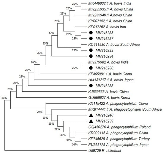 Phylogenetic analysis of the sequences of the 16S rRNA gene using the neighbor-joining method. The optimal tree with the sum of branch length = 1.36582012 is shown. The evolutionary distances were computed using the maximum composite likelihood method. The pathogens identified in the present study are marked in bold, where circles and triangles indicate A. bovis and A. phagocytophilum, respectively.