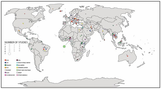 The most commonly identified reports of Strongyloides spp. were within primates (26% of all published works), and dogs (14% of all published works), as seen in Table A1. Other animals identified as environmental sources included cats, ruminants, rodents, and insects. Water, soil, as well as fruit and vegetables were all also identified as containing Strongyloides spp.