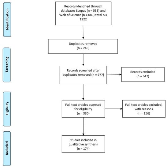 One thousand two hundred and twenty-two papers were retrieved from SCOPUS and Web of Science using the search terms identified as suitable, as seen in Table 1, with 174 articles identified as eligible for inclusion.