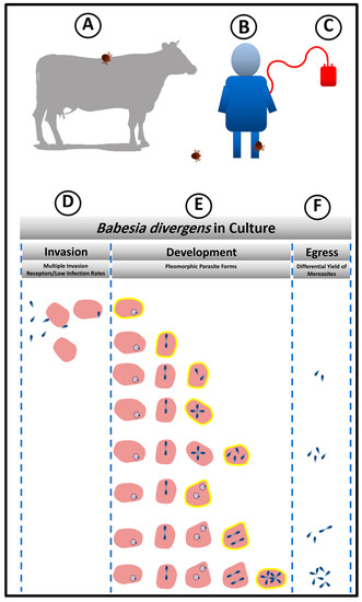Babesia parasites present a complex life cycle spanning two hosts—a tick vector and a mammalian host. Despite this, the parasite has successfully established itself as the second most common blood-borne parasites of mammals after trypanosomes. The genus Babesia comprises more than 100 species of protozoan pathogens that infect erythrocytes of many vertebrate hosts [1]. They are transmitted by their tick vectors during the taking of a blood meal from the host [1,2]. Babesiosis has long been recognized as an economically important disease of cattle, but only in the last 30 years some species of Babesia have been recognized as important pathogens in man—B. divergens being one such agent. B. divergens, a natural pathogen of cattle, is the main pathogen of human babesiosis in Europe [3,4,5], with the majority of cases being reported in the British Isles and France [6]. This review article will focus on the key strategies adopted by B. divergens that allow it to successfully establish itself in diverse hosts, despite changing and hostile environments including the parasite’s multiple modes of transmission, its spread as a zoonotic agent, unique facets of its asexual life cycle within the RBC that allow it to alter parameters of the cycle, and, finally, parasite persistence in the face of hostile environments, including nutrient deprivation and toxic chemicals.