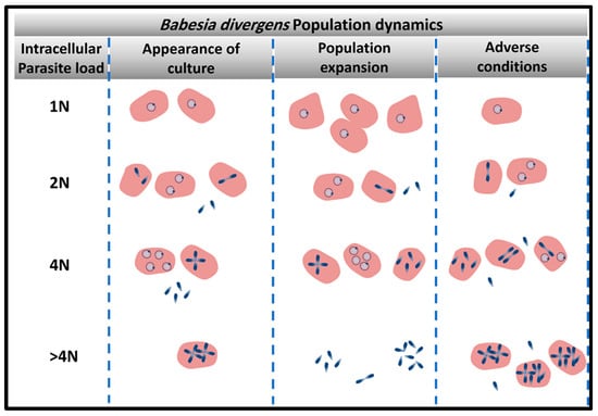 - Cursino-Santos, J.R.; Singh, M.; Pham, P.; Rodriguez, M.; Lobo, C.A. Babesia divergens builds a complex population structure composed of specific ratios of infected cells to ensure a prompt response to changing environmental conditions. Cell. Microbiol. 2016, 18, 859–874. [Google Scholar] [CrossRef] [PubMed]