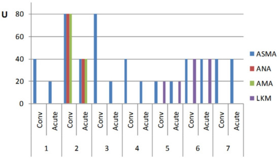 25]. The levels of ANA, ASMA, LKM, and AMA are reported in arbitrary units as either a ratio or units (U). The RF levels are expressed as mg/L. A negative titer, or normal range, was considered to be a background level of fluorescence with the sera diluted to 1:20 (or less than 20 U). Weakly positive results were from 1:20 to 1:30 dilution, and 20 to 30 positive results were greater than 1:30 dilution or greater than 30 U.
