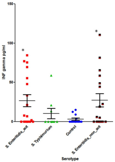 A statistically significant increase in systemic INF-γ was observed in S. Enteritidis-infected patients compared with the healthy control group (p = 0.02). In the case of S. Typhimurium infection, however, the difference was not statistically significant (p = 0.6).