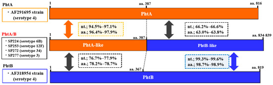 Genetic structure of the phtA/B (fusion type of phtA and phtB) gene identified in the present study and phtA and phtB in reference strains (GenBank Accession Nos. AF291695 and AF318954, respectively). The serotype of each isolate is indicated in parentheses. The phtA/phtA-like and phtB/phtB-like sequences are shown in orange and blue, respectively. Nucleotide (nt.) and amino acid (aa.) sequence identities of phtA-like and phtB-like regions of phtA/B gene with those of phtA and phtB genes are shown in squares with dotted lines.