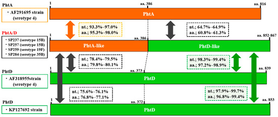 Pht profiles are summarized in Table 3. The most prevalent pht pattern was phtA + phtD + phtE (26.3%), followed by phtA/B + phtE (19.3%), phtA/B + phtD + phtE (17.5%), and phtA + phtB + phtD + phtE (14.0%). Pht gene profiles, including pht fusion type, were detected in 50.9% of all isolates. Structural organizations of the fusion types PhtA/B and PhtA/D (compared to PhtA, PhtB, or PhtD) are schematically represented in Figure 1 and Figure 2, respectively. The sequence alignment of these genes is shown in the Supplementary Materials, Figures S1 and S2. These fusion-type Pht proteins were constituted by the N-terminal half of the phtA-like region and the phtB- or phtD-like region in the C-terminal side. The phtA-like region of phtA/B from the four isolates (aa.1–387) had 94.5–97.1% sequence identity with phtA in a reference strain (AF291695) and 76.7–77.9% identity with phtB in a reference strain (AF318954). In contrast, the phtB-like region (aa.387–) of phtA/B showed 99.3–99.6% identity with the phtB sequence. Similarly, phtA/D of the four representative isolates showed 93.3–97.0% identity with phtA (AF291695) in the phtA-like region and 97.9–99.7% identity with phtD (AF318955 and KP127692) in the phtD-like region. The nucleotide sequence identity within phtA/B was 96.6–98.4%, and similarly, 97.6–97.9% identity was found within phtA/D (Supplementary Materials, Table S2). In the present study, nucleotide sequences of phtB were determined for five isolates (Supplementary Materials, Table S3), which showed 97.6–99.4% identity with the phtB gene reference strain AF318954. In addition, phtA had 69.2–70.5% identity with phtB and phtD; 92.6–93.0% identity was found between phtB and phtD; and phtA/B and phtA/D had 78.1–90.0% identity with phtA, phtB, and phtD.