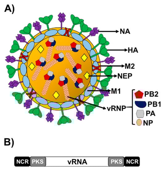 Influenza A virus structure and genome organization. (A) Virion structure: Influenza A viruses include a lipid envelope containing the two viral glycoproteins (HA, green and NA, purple). The ion channel M2 (red) protein is also located in the membrane. Under the viral bilayer is located a protein layer composed of the M1 (light blue) protein, and the NEP (yellow). Inside the virion are located the eight vRNA segments coated by the NP (pink) as viral vRNP complexes and associated with the viral polymerase complex made of the three polymerase subunits PB2 (red), PB1 (blue) and PA (gray). Viral components in the vRNP and in the viral particle are indicated. (B) Genome organization: Influenza A virus contains eight ss, negative-sense, viral RNA segments (PB2, PB1, PA, HA, NP, NA, M, and NS). Each viral segment contains non-coding regions (NCR, black) and the packaging signals (PKS, gray) at the 3′ and 5′ termini in each of the viral segments.