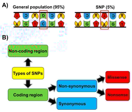 Currently, particular attention is being paid to single nucleotide polymorphisms (SNPs) that are loci within the genome of an organism in which two or more alleles can exist. SNPs affect a single nucleotide or base pair and they are one of the most frequent types of genetic variations in the genome [,,]. SNPs need to be presented into the population with a frequency equal to or greater than 1% to be considered as polymorphisms. There are multiple types of SNPs, depending on their location that can be in different regions of the genes such as promoters, exons, introns or UTRs (Figure 2). SNPs in coding regions are classified as synonymous, when a nucleotide substitution does not change the amino acid sequence of the encoded protein, although other effects, such as changes in mRNA structure or folding may account for variation in protein expression. On the other hand, non-synonymous SNPs are divided in missense or nonsense. In the first case, nucleotide substitution results in the change of one amino acid for another, affecting the protein sequence coded by a gene and therefore may lead to its dysfunction. In contrast, nonsense mutations are produced when instead of substituting one amino acid for another, the altered gene contains an early stop codon in the ORF or a stop codon is abrogated, producing an elongated protein. This type of mutations results in shortened or elongated proteins leading typically to nonfunctional proteins. The functional role of SNPs in coding areas of the genome can be easily analyzed by studying the gene products. However, most SNPs fall within non-coding genome regions, therefore, predicting their effects is challenging. For example, SNPs in the promoter regions could affect their activity and regulation producing changes in gene expression levels. SNPs in UTRs or intron regions have been related with an effect in protein translation or the production of splice variants of transcripts, leading to longer or shorter protein sequences, respectively.