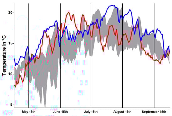 Temperature profile, representing mean daily temperature within the Isar River during sampling periods in 2017 (red) and 2018 (blue), compared with temperature range of the preceding four years (grey area). Data from the Bavarian Agency of Environment (https://www.gkd.bayern.de).