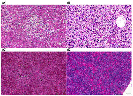 Histology of brown trout liver and spleen, HE stain, (A) liver with multifocal liquefactive necrosis (center) and viable hepatocytes without vacuolation suggesting depletion of glycogen stores; (B) liver from a healthy brown trout; (C) congested spleen with lymphocytic depletion of white pulp areas; (D) spleen from a healthy brown trout; bars = 100 µm.
