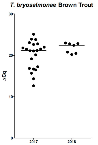 To monitor PKD presence in healthy trout, we decided to use non-affected brown trout caught by fly fishery before and after reported mortalities occured. During fishing season in 2018 (May–October), selected local anglers were asked to provide kidney samples from caught brown trout. However, neither the authors nor the participating anglers did catch a single brown trout, only rainbow trout were captured (n = 50). Although brown trout were not captured, we still examined the rainbow trout posterior kidneys as a surrogate to assess PKD presence. In the qPCR analysis, 33/50 of rainbow trout posterior kidney samples were PKD positive. The distribution of ∆Cq values of the positive rainbow trout was comparable to the range detected in the brown trout (Figure 8).