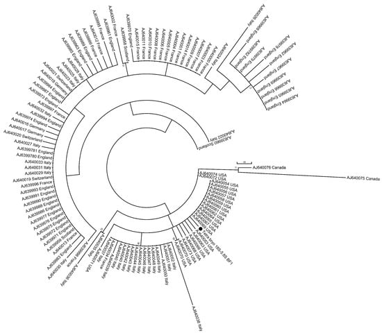 Phylogenetic analysis of T. bryosalmonae, including the Isar strain (black dot) grouped into the North American clade of T. bryosalmonae.