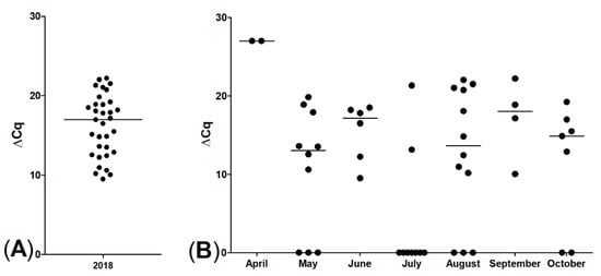 qPCR for T. bryosalmonae of rainbow trout posterior kidneys, ∆Cq values, (A) 33/50 positive; (B) sampling months of all rainbow trout; displaying spread of proliferative kidney disease (PKD) infection during the whole fishing season, bars represent medians.
