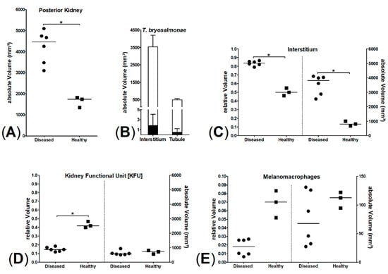 Stereology of posterior kidney of six diseased and three healthy brown trout; significant differences marked by * (p = 0.0238, Mann–Whitney test). (A) Comparison of posterior kidney volumes, (B) parasite volumes (interstitial and tubular parasite stages in sum, black bars) compared to mean interstital and tubular volumes (white bars), (C) interstitium, relative (left) and absolute (right) volumes of interstitial kidney tissue, (D) kidney functional unit [KFU], relative (left) and absolute (right) volumes of KFU, (E) melanomacrophages, relative (left) and absolute (right) volumes of melanomacrophages.