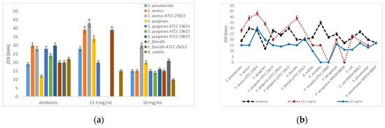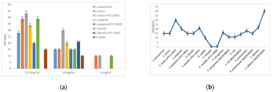Disc diffusion assay of [Na(12-crown-4)2]I3: (a) Dilution series (13.3, 10 and 4 mg/mL) against Gram-positive bacteria.; (b) Dilution of 10 mg/mL against all studied microorganisms. The values are means from three repetitions and error bars are standard deviations (SD).
