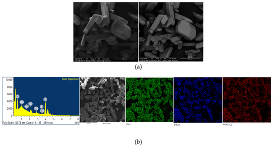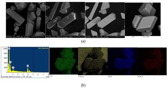 The microstructural properties (morphology, size, distribution, surface state and elemental mapping) of [Na(12-crown-4)2]I3 were analyzed by a scanning electron microscope (Quanta SEM) at 5 and 10 kV with low and high vacuum mode. The results regarding surface morphology, composition details and elemental energy-dispersive X-ray spectroscopic (EDS) information are in agreement with previous findings obtained through different analytical methods [29]. Figure 4 and Figure 5 illustrate the micrographs obtained at different magnifications under environmental and high vacuum conditions, respectively. The EDS analysis confirms the purity of the compound (Table 3 and Table 4). The low vacuum mode measurement was performed with an uncoated sample while in the high vacuum mode the sample was coated with Au/Pd using a sputter coater. The surface morphology was analyzed through secondary electron imaging (SE), while the composition details were revealed by backscatter secondary electron imaging (BSED).