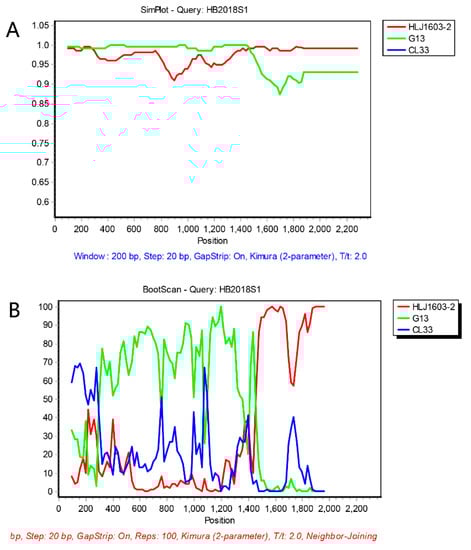 Simplot and BootScan analysis of the variant strain HB2018S1. HB2018S1 was a recombinant of the reference strains G13 and HLJ1603-2.