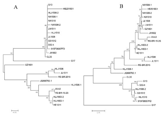 The SimPlot 3.5.1 and RDP 4.36 software were used to predict the possibility of recombination events in the AGV2 genome. As shown in Table 2, four recombination events were identified. In recombination event 1, the recombination sites of seven strains were identical, and all the strains covered belonged to branch I; moreover, in this study, HB2018S1 was also included in recombination event 1. The recombination occurred between the relatives of viruses within the clade of G13 (from CL33 to 915F06007FD) and the relatives of viruses within the clade of HLJ1603-2 (from Ave3 to HLJ1603-1). The recombinant virus gave origin to the whole clade that includes HB2018S1 (Figure 2). The recombination event was mapped at 100–1542 nts, and the region related to recombinant event is shown in Figure 3, which was created using the SnapGene software. This region (100–1542 nts) was similar to G13 (99.5%), and the remaining AGV2 genes were similar to HLJ1603-2 (99%). To further prove the occurrence of recombination events, we split the genome into two parts at recombinant sites 100 and 1542 nts and constructed phylogenetic trees. As shown in Figure 4A, according to the 100–1542 nts of the whole genome, HB2018S1 and G13 belong to the same branch and are far from HLJ1603-2. Conversely, phylogenetic trees constructed on the basis of the remaining partial whole genome show that HB2018S1 and HLJ1603-2 belong to the same branch and are far from G13 (Figure 4B). These results were in accordance with the recombination prediction.