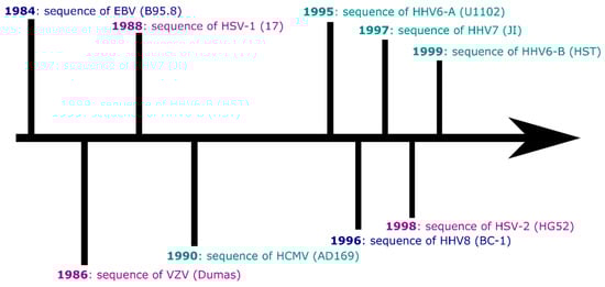 A timeline of human herpesvirus genome sequence publication (strain name in brackets). Alphaherpesviruses are marked in magenta; betaherpesviruses are marked in teal; gammaherpesviruses are marked in dark blue.
