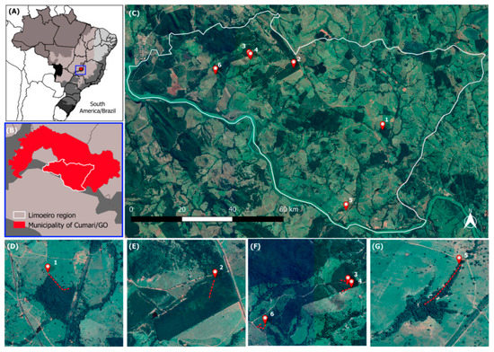 Study area located in the Limoeiro region, municipality of Cumari, southeast of Goiás State, Brazil (A–C), formed by private cattle farms with forest remnants where small mammals were captured. Figures (D–G) show the arrangement of the six transects (1 to 6) at the edges of forest remnants.